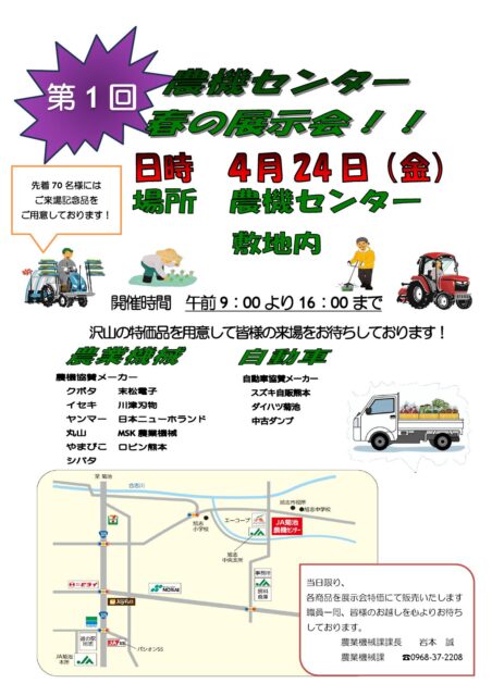 日頃よりJA菊池をご利用いただき誠にありがとうございます! 農機車輌部農機センターでは春の展示会を開催いたします。 …