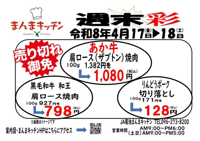 17日(金)~18日(土)の2日間はまんまキッチン週末彩 【精肉コーナー】 黒毛和牛『和王』ロ肩ロース焼肉100g通常価格9…