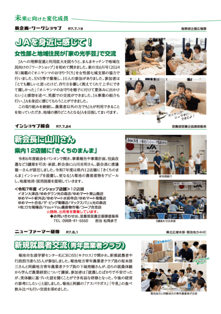 お知らせ 2025.09.20 お知らせ 未来に向けた変化成長 管内のさまざまな取り組みをご紹介します! クリックすると拡大してご覧いただけます。 この記事は、JA菊池広報誌いぶき10月号P7にも掲載しております。