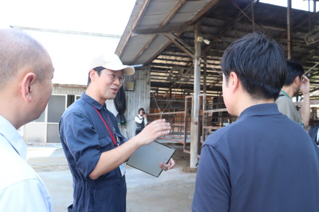 JA菊池は8月29日、地元メディアを招いて農畜産物の説明会を菊池市で開きました。乳牛の暑熱対策でメディアから取材を受け、部会の役員らが生産管理について丁寧に説明し、牛乳の試飲を提供しました。