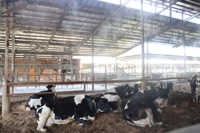 同JA管内は西日本有数の酪農地帯で、生乳は夏に需要期を迎えています。環境の変化に敏感な乳牛を暑熱ストレスから守るため、牛舎では扇風機やミストを使用した対策を行い、乳量アップを図っています。