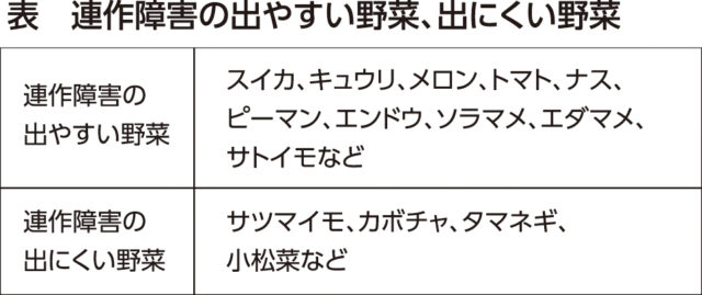 同じ畑に同じ野菜を連続して作ることを「連作」といいます。連作すると生長に障害が出る野菜があります。エンドウは一度作ると、4、5年は作れません。ナス、トマト、ソラマメ、サトイモなどは3、4年、レタス、ハクサイ、イチゴなどは2年、ホウレンソウ、コカブ、インゲンなどは1年です。サツマイモ、カボチャ、タマネギのように連作しても生長に障害が見られない野菜もあります(表)。