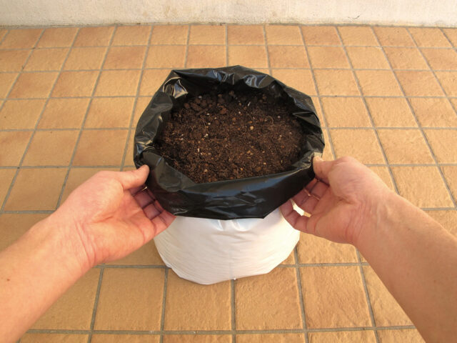 コンテナは、14L程度の市販の培養土の袋をそのまま使う。後で約15cm分の土(約6L)を足す(増し土)ので、その分の土はよけておく。