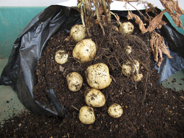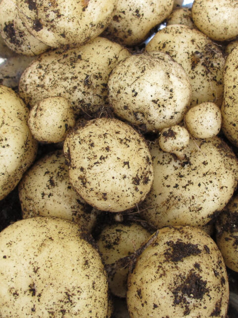出芽後10日ほど、土の中では種イモから伸びた茎の少し上の部分からイモになる茎(ストロン)が横に伸びてきます。さらに10日ほどでストロンの先にイモができ始めます。この2回のタイミングで土を足します。茎葉が黄変してから収穫すると品質の良いイモが採れます。