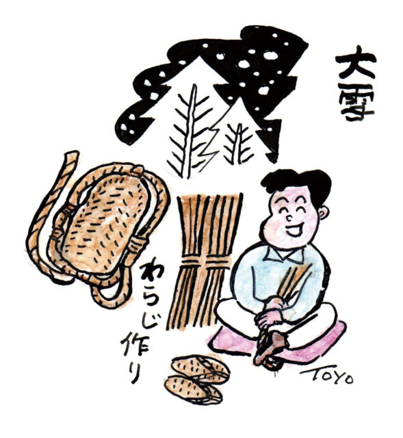 二十四節気の大雪は、いよいよ雪が降りだす頃。本格的な冬の到来に備えます。かつては雪で閉ざされた農閑期に、収穫が終わった稲わらから1年分の家族のわらじや俵を編んだそうです。特にこの時期は新わらからお正月のしめ縄を作り、縫い物にも精を出しました。