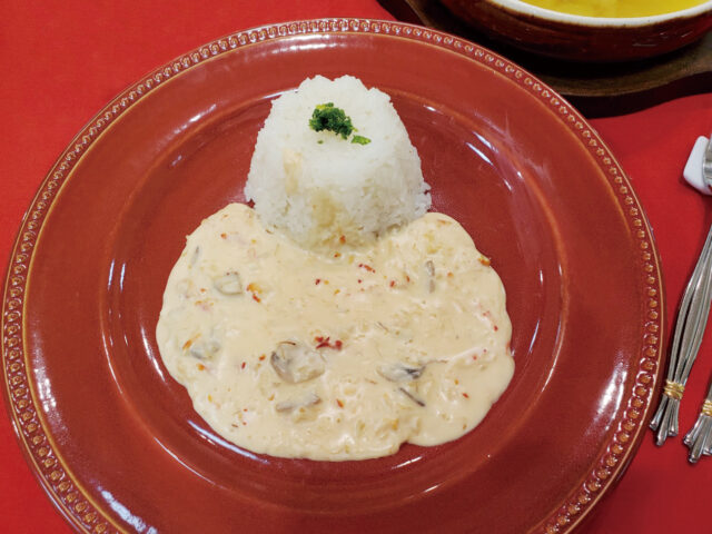 バターライスにかにのクリーム煮を添えたワンプレート料理です。カニは冷凍でも缶詰でもОK。殻などは除いてしっかりほぐしましょう。