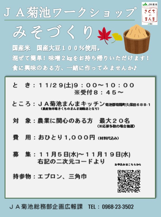 JA菊池では、11月29(土)にJA菊池まんまキッチンにて、みそづくりワークショップを開催します☆