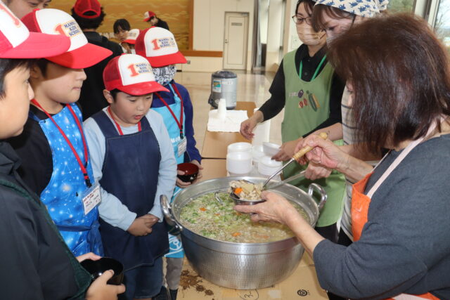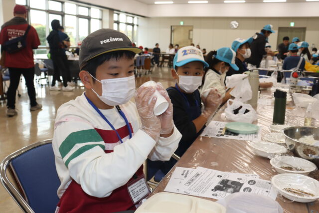 紙コップを使ったコロコロおにぎりづくりでは、菊池産の米を使用。昼食では女性部員が作った地元野菜たっぷりの豚汁と一緒におにぎりを食べました。