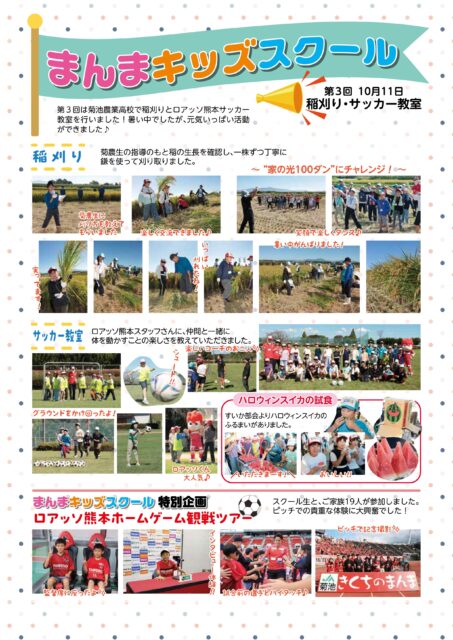まんまキッズスクール 2025.12.04 まんまキッズスクール まんまキッズスクール 第3回 稲刈り・サッカー教室 クリックすると拡大してご覧いただけます。 この記事は、JA菊池広報誌いぶき12月号P18にも掲載しております。
