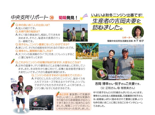 お知らせ 2025.12.05 お知らせ 中央支所リポート㊴ 菊陽発見! いよいよ秋冬ニンジン出番です!生産者の吉岡夫妻を訪ねました♪ クリックすると拡大してご覧いただけます。 この記事は、JA菊池広報誌いぶき12月号P19にも掲載しております。