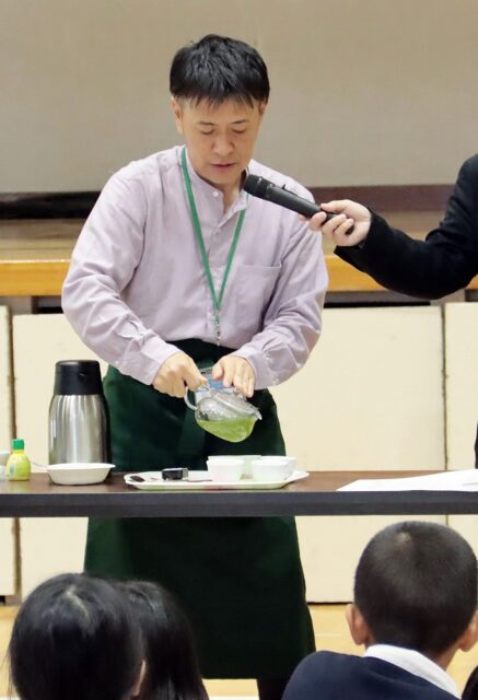 JA菊池茶部会青年部は地元特産の茶の魅力を知ってほしいと、地元の小学生に向けてのお茶講座を始めて13年。5年生を中心に、1校から始まり、徐々に要望が高まり今年は町内の小学校6校で講座を開き、約500人の児童が参加しました。