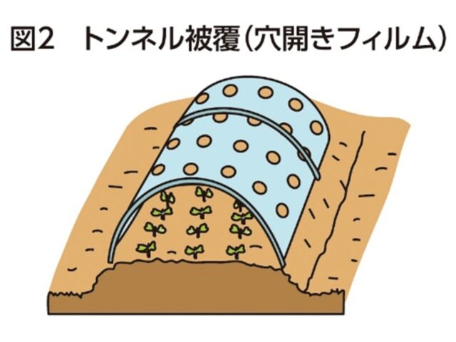 中間地や暖地の2、3月ごろはまだ夜温は低いですが、昼間のトンネル内は高くなるため、本葉1、2枚の頃から換気を開始します。フィルムの裾を開閉する方法、フィルムに穴を開ける方法、穴開きフィルムを使う方法があります(図2)。生育後半にトンネル内の茎葉が繁茂する頃にはトンネルを除きます。
