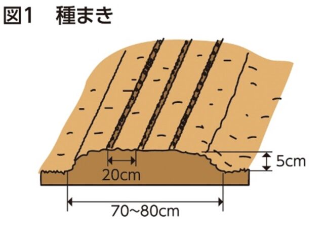 条間20cm、深さ1cm程度の浅いまき溝を3条作り、約1cm間隔で種まきします(図1)。好光性種子のため、覆土はごく薄くかけます。種まき後、十分に灌水(かんすい)し、発芽まで乾燥させないように注意します。種まき後にトンネル被覆して、中に幼苗を保護するための不織布をべたがけすると良いでしょう。