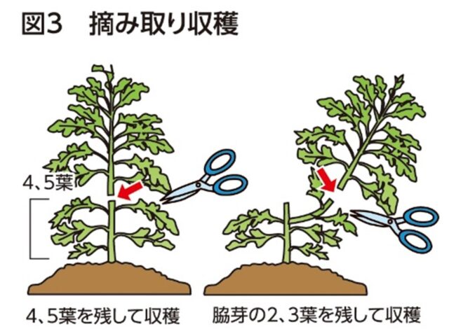 中葉種の株立ち型は、草丈が25~30cm程度になったら、葉4、5枚を残し、摘み取り収穫します。以後、伸びてきた脇芽の葉を2、3枚残して切り取ります(図3)。