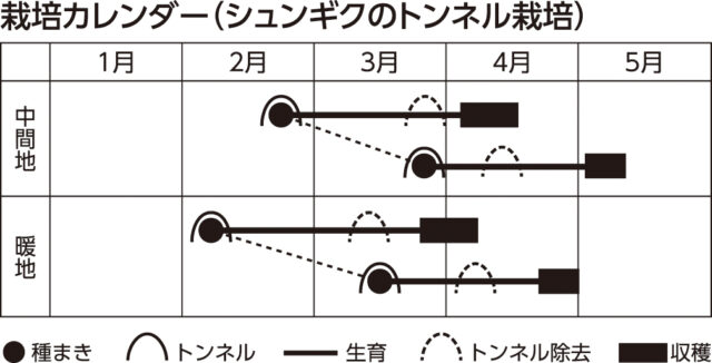 シュンギクの生育適温は15~20度と冷涼な気候を好み、一般には春(3~5月)と秋(9~11月)が栽培適期ですが、早春まきのトンネル栽培では春から初夏の収穫を楽しめます。