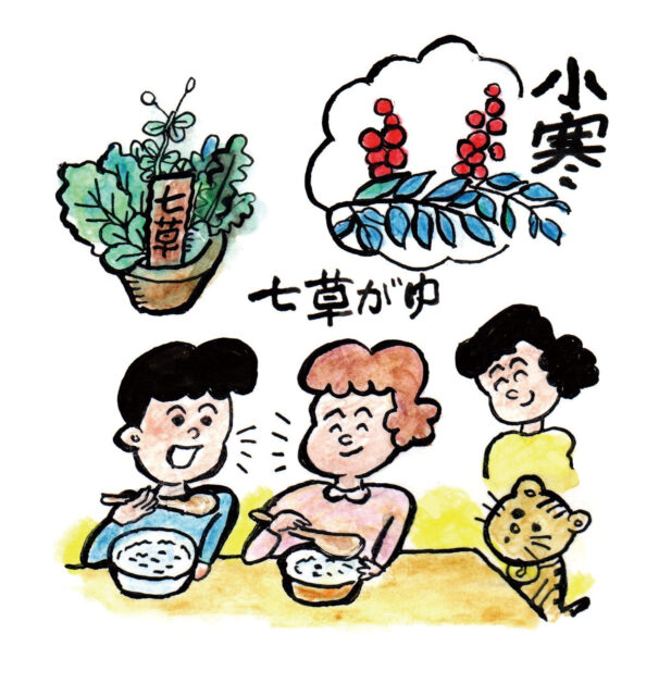 1月7日は人日の節句。この日に汁物をいただく風習が日本の七草がゆの行事となりました。セリ・ナズナ・ゴギョウ・ハコベラ・ホトケノザ・スズナ(カブ)・スズシロ(ダイコン)が入ったおかゆで胃腸を整え、寒さに備えましょう。