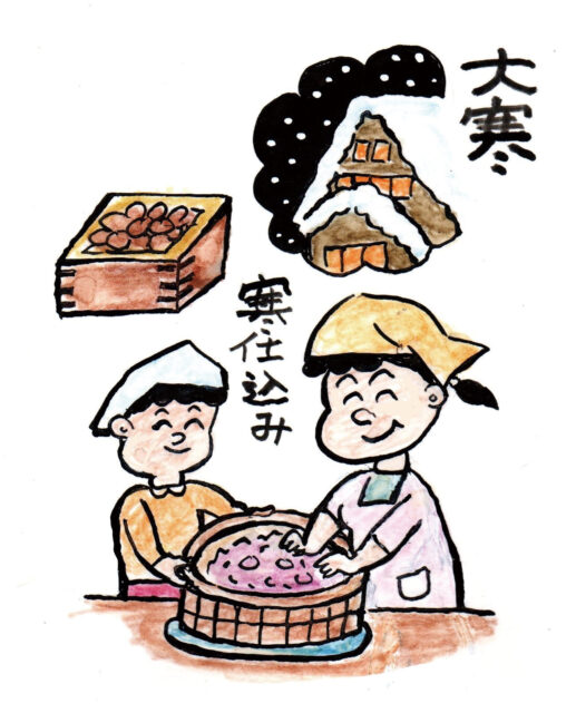 この時季は寒くて雑菌が繁殖しにくいため、秋に収穫した穀物を使って、農閑期にみそやしょうゆ、酒などの発酵食品を仕込む「寒仕込み」に適しています。寒さで発酵と熟成がゆっくり進むので、寒仕込みをすると味わい深く出来上がるといわれています。寒いのも悪いことばかりではありませんね。