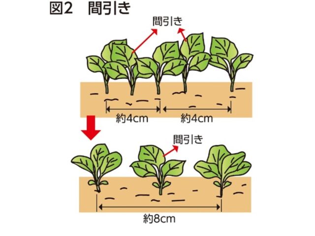 本葉1枚で株間が約4cm間隔になるように間引き、2回目は本葉3、4枚で株間が約8cm間隔になるように間引きます(図2)。