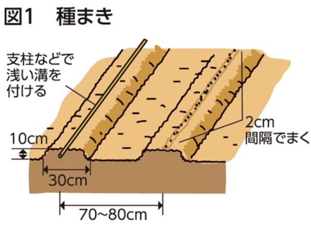 種皮に発芽抑制物質があるため、水に一晩浸しておきます。まき溝に約2cm間隔で種をまきます。好光性種子のため土は薄くかけ、鎮圧します。発芽まで約2週間かかるため、その間土を乾かさないことが大切です。発芽促進と幼苗の保護のため、不織布によるべたがけが有効です。