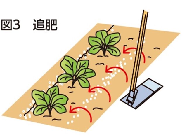 1回目は株定め後、化成肥料を畝の両側に合計で1m当たり20~30g、2回目は本葉8、9枚の頃に50g施します。いずれも、追肥後は除草を兼ねて中耕・土寄せしておきます(図3)。