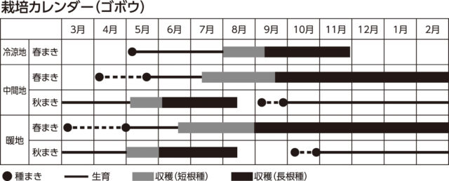 高温性で、発芽適温は20~25度、生育適温は20~30度ですが、生長したゴボウは寒さにも強いです。長く真っすぐな根を作るためには、下層まで土粒の細かい畑が適しています。春まき冬取りと秋まき夏取りができますが、春まきの方が栽培しやすいです。