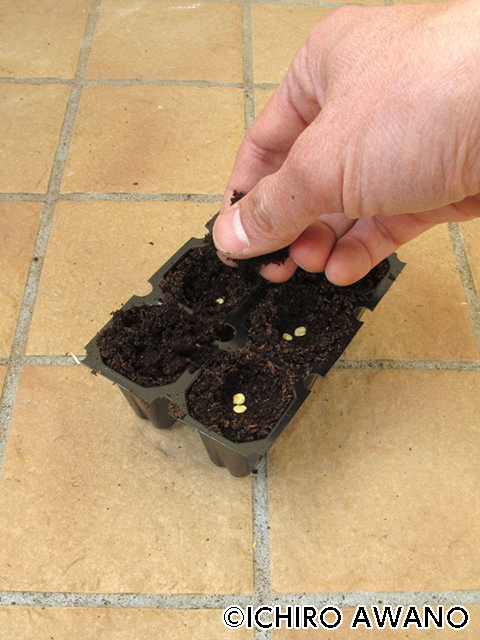 128穴サイズセルトレーに、育苗用の土を入れて深さ10mmのまき穴を開け、2、3粒ずつ種をまく。覆土し、表面をならしたら、しっかり水やりする。出芽までは地温30度を維持する。10日ほどで出芽がそろったら地温は25度にして、日中は30度を超えないようにする。本葉1、2枚の頃に1穴1株になるよう間引く。
