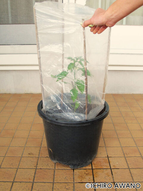 5月中は保温と防風のために苗の周囲に支柱を4本立て、底を切り抜いたビニール袋で囲み、洗濯ばさみでとめて「あんどん」を作ると効果的。