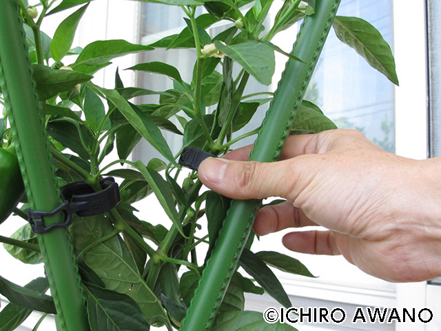 誘引する茎以外の枝は放任するか、2、3果付けて摘芯する。