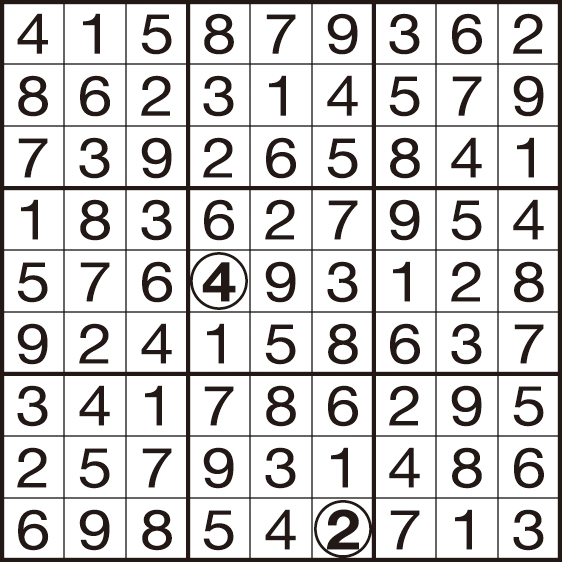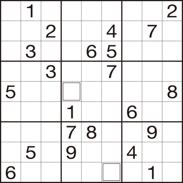 (2)タテ列(9列)、ヨコ列(9列)、太線で囲まれた3×3のブロック(それぞれ9マスあるブロックが9つ)のいずれにも1から9までの数字が1つずつ入ります。