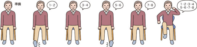 さて今回は、脚を伸ばす運動と足踏みをご紹介します。寒さで外出して歩くことが困難な場合は、室内でいすに座ったまま体を動かしてみませんか。深く腰かけ過ぎず、やや浅めに座って無理のない範囲で取り組んでみましょう。