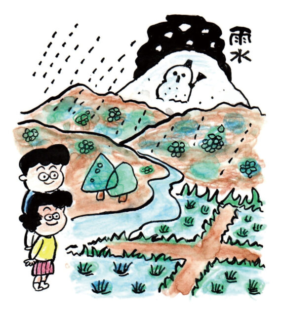 二十四節気の雨水は、それまで雪が降っていたのが雨に変わる頃。徐々に気温も上がり、田畑の霜や山に積もっていた雪も溶けてせせらぎになっていきます。寒い日が3日続いて暖かな日が4日続く、というような気候が交互に繰り返されるのを「三寒四温」と呼びます。