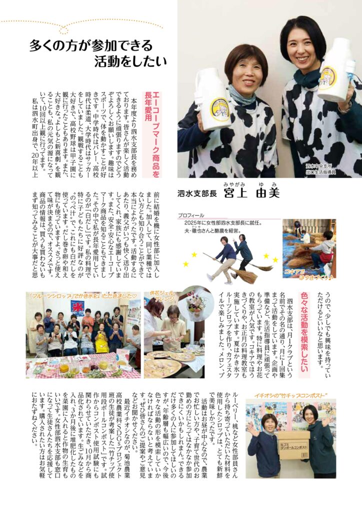 女性部 2026.01.23 女性部 JA菊池女性部紹介 泗水支部長 多くの方が参加できる活動をしたい クリックすると拡大してご覧いただけます。 この記事は、JA菊池広報誌いぶき2月号P12にも掲載しております。 女性部活動紹介 記事一覧へ カテゴリー お知らせ 組合長からのメッセージ 各部署からのお知らせ 求人情報 新型コロナ感染症の対応 きくちのまんま新聞 イベント情報 女性部 青壮年部 まんまキッズスクール めぐみの里だより 防疫協議会だより CBSだより 広報誌 いぶき コミュニティーいぶき ほっと一息 プレゼントクイズ 家庭菜園コーナー 旬の情報 レシピ SDGSで検索