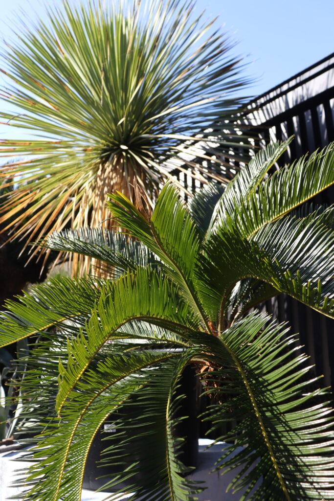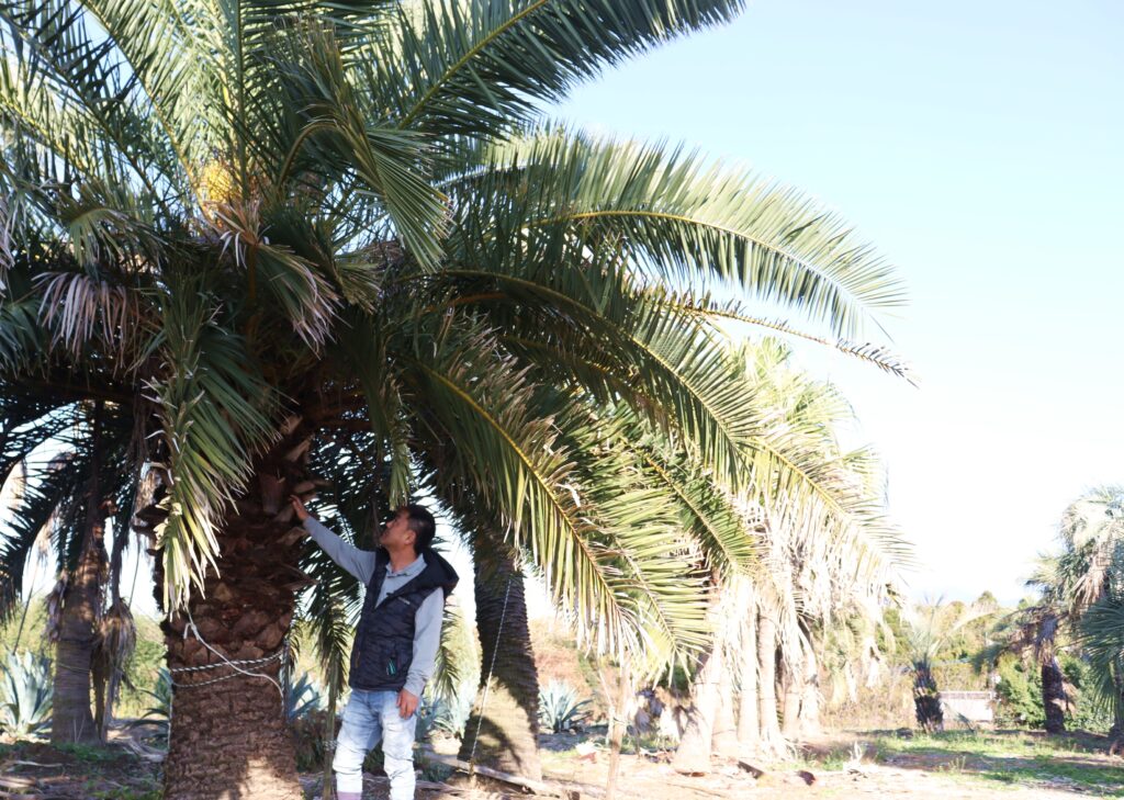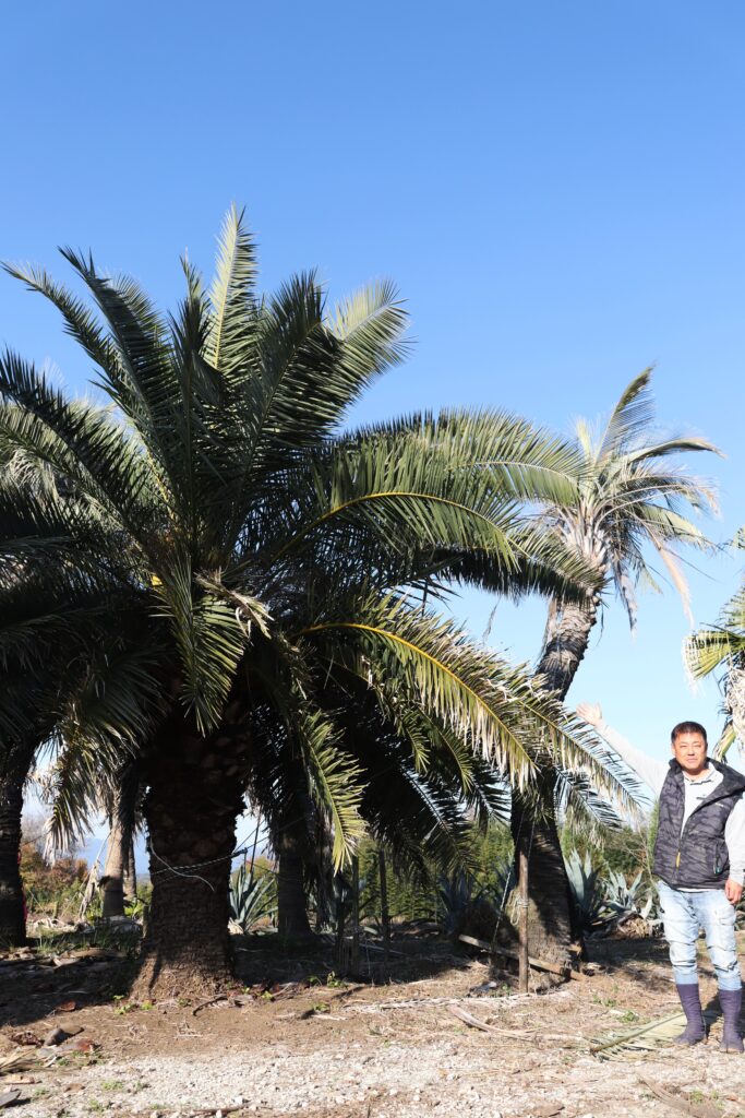 有田さんはココスヤシの木やソテツ、松など大きい樹木を専門に取り扱い、菊池市の3,000平方メートルの圃場で年中栽培しています。以前は会社勤務をしていたが、父の代を引き継ぎ、20年以上になります。今では数十種類の木々を栽培。