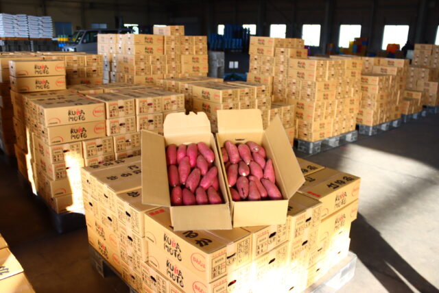 JA菊池管内ではサツマイモが出荷最盛期を迎えています。大津町にあるJA南営農センターでは、最大で日量約15トンを集荷し、広島を中心に、中国、九州へ出荷。品種は「ほりだし君(高系14号)」と「べにはるか」。出荷は6月まで続き、出荷量1450トンを見込んでいます。