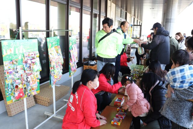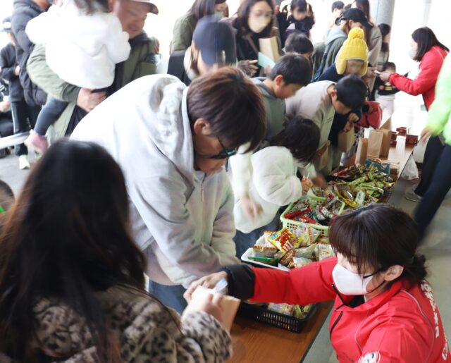 合志中央支所では、くじ引きや菓子の詰め放題、JA菊池のブランド米「七城のこめ」の贈呈、女性部手作りの豚汁も振る舞われ、参加者からは「子どもたちが楽しめる催しが多く家族で楽しめた」「地元の野菜がたくさん入った温かい豚汁が寒い体に染みておいしい」といった声が上がりました。