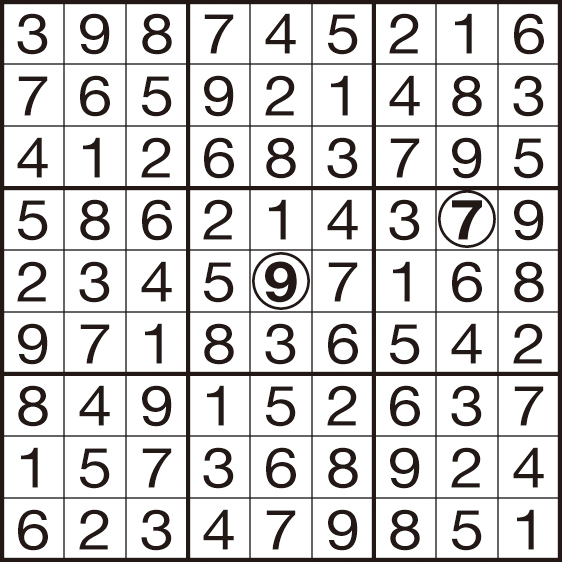(2)タテ列(9列)、ヨコ列(9列)、太線で囲まれた3×3のブロック(それぞれ9マスあるブロックが9つ)のいずれにも1から9までの数字が1つずつ入ります。