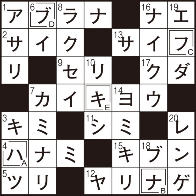 二重マスの文字をA〜Eの順に並べてできる言葉は何でしょうか?