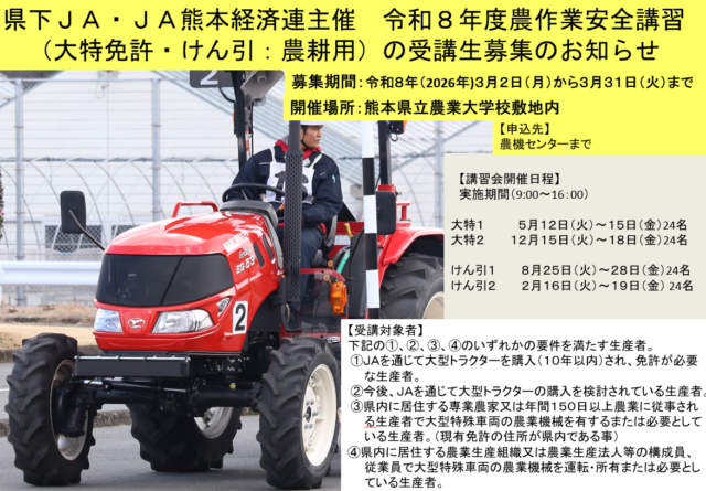 令和8年度農作業安全講習(大特免許・けん引:農業用)の受講生募集のお知らせ