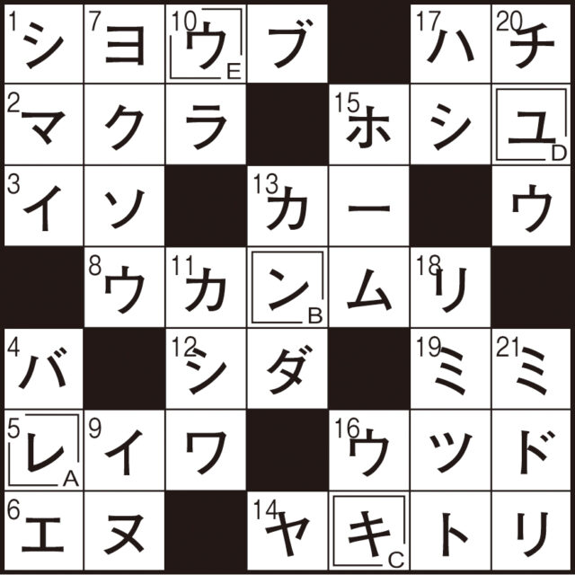 二重マスの文字をA~Eの順に並べてできる言葉は何でしょうか?