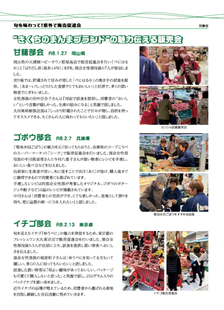 お知らせ 2026.03.28 お知らせ 未来に向けた変化成長 “きくちのまんま”ブランドの魅力伝える販売会 クリックすると拡大してご覧いただけます。 この記事はJA菊池広報誌いぶ4月号P5にも掲載しております。 【復旧のお知らせ】農機車輌部カークリニック 電話回線復旧のご案内 記事一覧へ カテゴリー お知らせ 組合長からのメッセージ 各部署からのお知らせ 求人情報 新型コロナ感染症の対応 きくちのまんま新聞 イベント情報 女性部 青壮年部 まんまキッズスクール めぐみの里だより 防疫協議会だより CBSだより 広報誌 いぶき コミュニティいぶき ほっと一息 プレゼントクイズ 家庭菜園コーナー 旬の情報 レシピ SDGSで検索