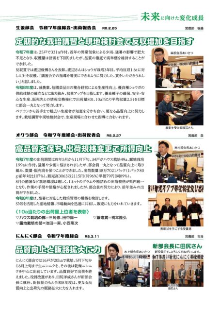 お知らせ 2026.04.22 お知らせ 未来に向けた変化成長~営農部~ 生姜部会/オクラ部会/にんにく部会 クリックすると拡大してご覧いただけます。 この記事は、JA菊池広報誌いぶき6月号P4にも掲載しております。 メロン部会を紹介します! 記事一覧へ カテゴリー お知らせ 組合長からのメッセージ 各部署からのお知らせ 求人情報 新型コロナ感染症の対応 きくちのまんま新聞 イベント情報 女性部 青壮年部 まんまキッズスクール めぐみの里だより 防疫協議会だより CBSだより 広報誌 いぶき コミュニティいぶき ほっと一息 プレゼントクイズ 家庭菜園コーナー 旬の情報 レシピ SDGSで検索