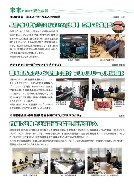 お知らせ 2026.04.24 お知らせ 未来に向けた変化成長~営農部②~ すいか部会/プレスリリースでPR強化/市場取引会議 クリックすると拡大してご覧いただけます。 この記事は、JA菊池広報誌いぶき6月号P7に掲載しております。