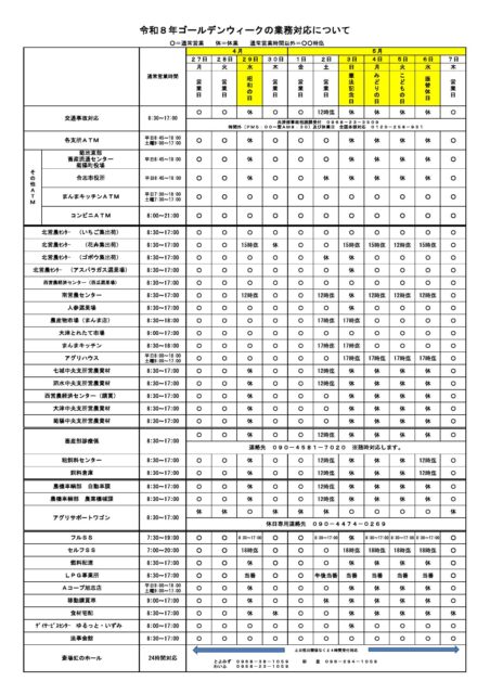 JA菊池では令和8年ゴールデンウィークの業務対応について以下のとおりとさせていただきます。