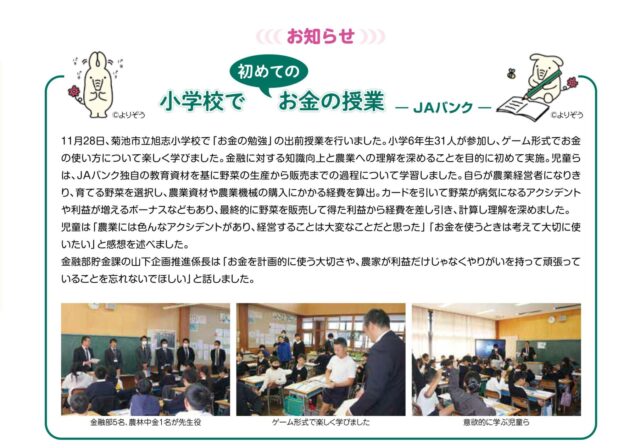 ●小学校での初めてのお金の授業 ●生活応援キャンペーン クリックすると拡大してご覧いただけます。 この記事は、JA菊池広報誌い…