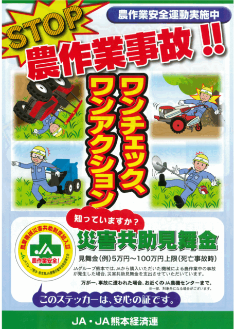 農機車輌部よりお知らせです。 10月は農繁期で、農作業事故が多発する時期です。家族や仲間の声かけで安全確認をお願いします。 急がず、焦らず、…
