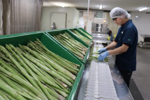 グリーンアスパラガス出荷最盛!! JA菊池管内で、グリーンアスパラガスが出荷最盛期を迎えています。新型選別機がフル稼働して日量1000キロを…